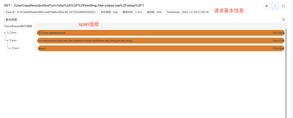 如上图,span中橙色的部分代表span的起止时间范围,颜色越深、长度越长对应的耗时越长
