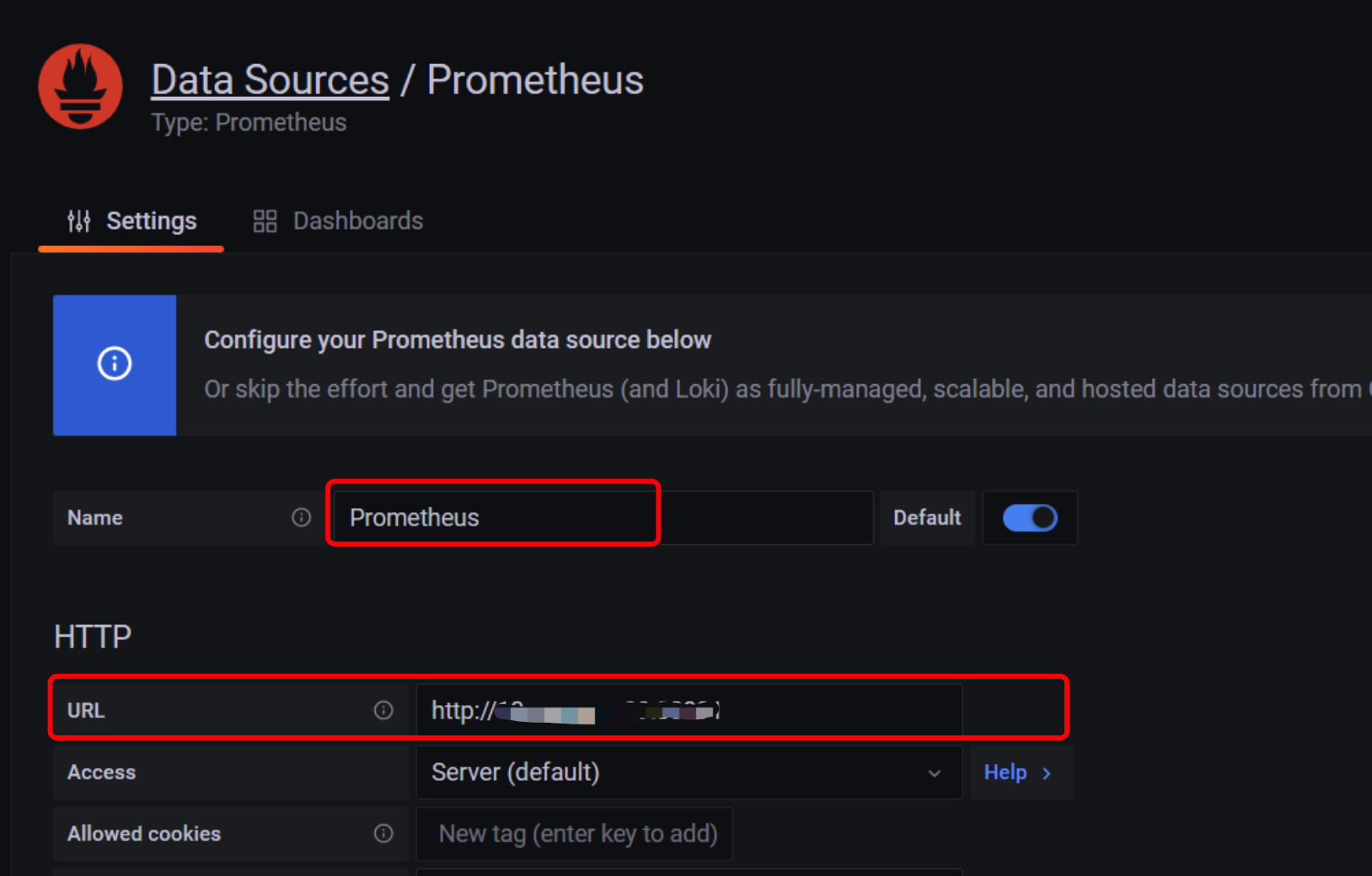 Configure the installed Prometheus address in the cluster. The data source name must be Prometheus.