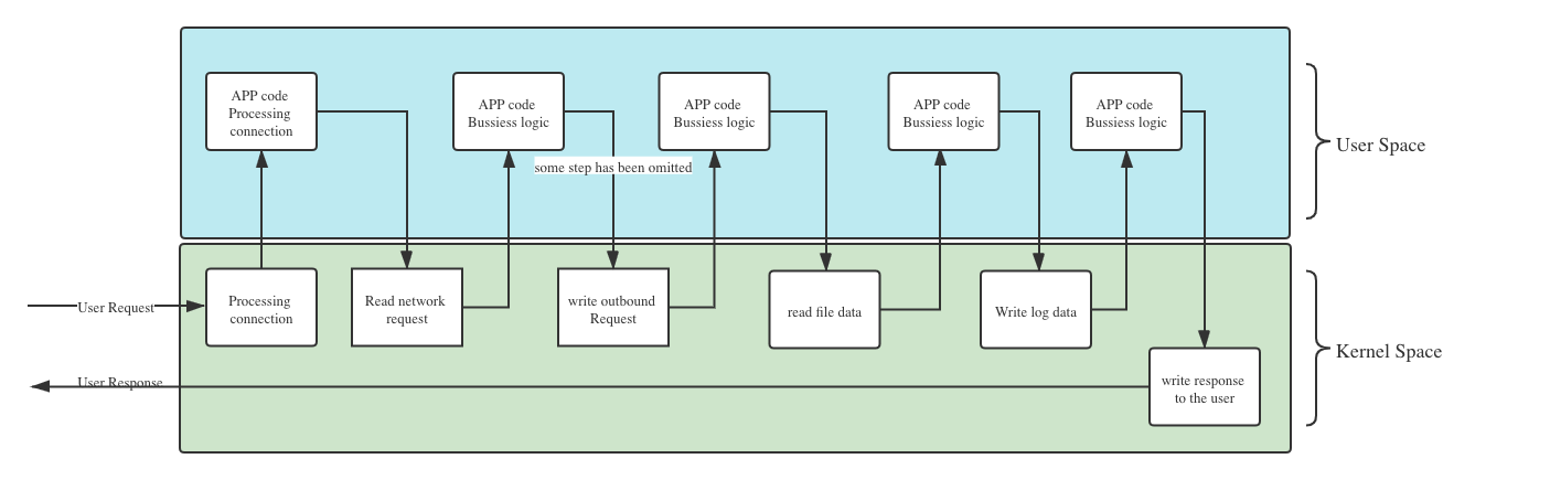 Scenario: When a user access the apps, the apps code will ask the kernel to accept the incoming network request, and receive all the network bytes. After that the apps code will do some business logic, or calling other service, or ask the kernel to read some files or write some logs data to files. After finish the processing, the app code will ask the kernel to send the response back to the user by network.